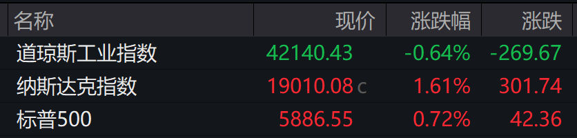 昨夜,美股三大指数收盘涨跌不一,纳指涨超300点,涨幅为1.61%;道指跌0.64%,标普500指数涨0.72%。